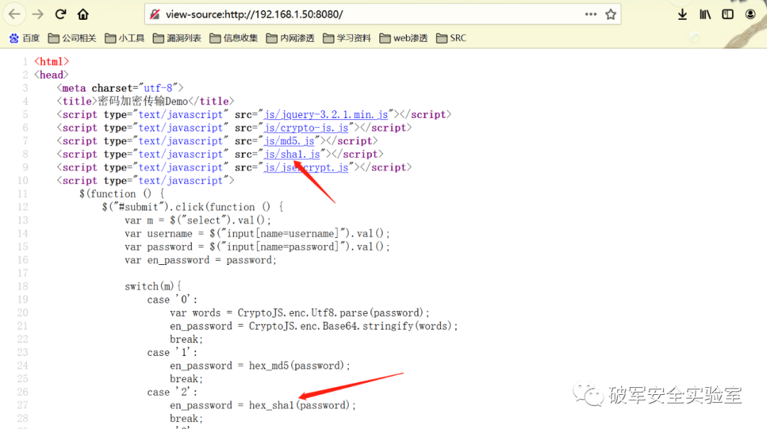 2、直接F12查看网页源码,查看前端采用的加密方式,这里以SHA举例。