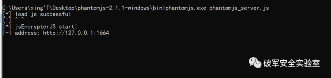 4、然后将aes.js、phantomjs_server.js两个js文件放在phantomjs.exe目录下,然后执行phantomjs_server.js文件,可以看到本地会新增一个127.0.0.1:1664的服务。