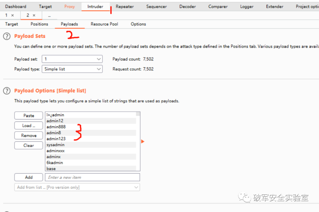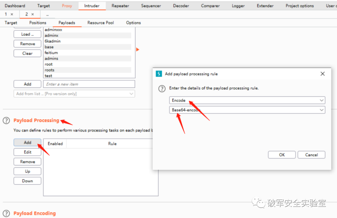 2、密码参数”p”结尾两个等号,初步判断为base64加密,发送到Intruder模块,添加Fuzz字典