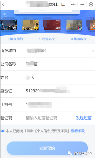 漏洞危害:恶意攻击者可以通过提交虚假信息进行信用卡办理预约,由于服务端校验不严格导致可以提交任意身份信息进行预约,可后台添加大量虚假订单。