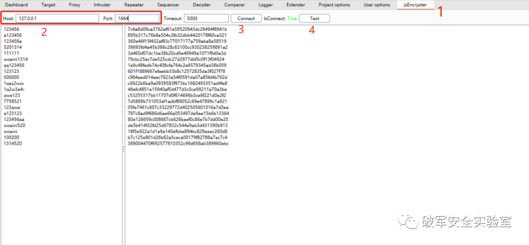 5、最后在Burp使用插件连接phantomjs_server.js中开启的webserver