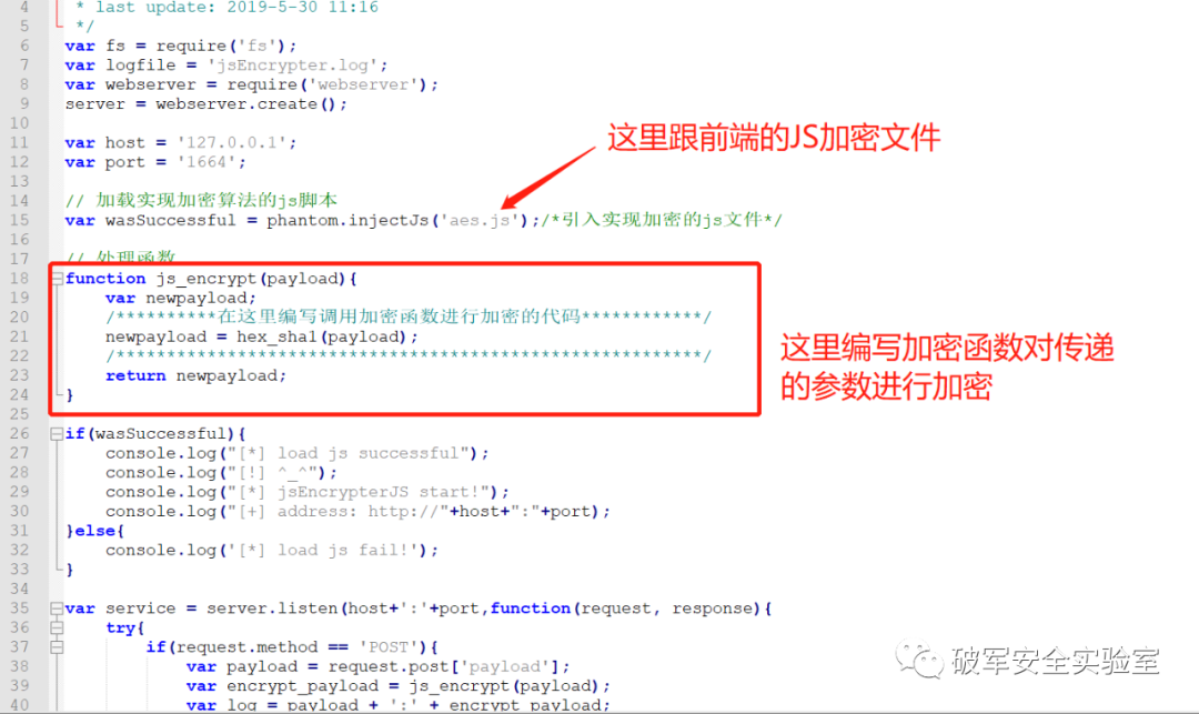 本次没有选择JS解密的原因在于对测试直接加密会好一点,但是也存在一定的局限性,可能会不知道加密方式,或者一些复杂的加密方式会存在密钥的情况下,实现前端加密Fuzz会比较困难,后期会想办法解决这一问题,其次就是本次的测试的核心脚本phantomjs_server.js有两个地方需要注意: