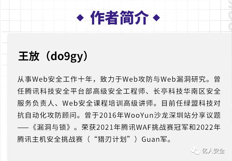 王放,网名 do9gy,从事Web安全工作十年,致力于 Web 攻防与Web漏洞研究。曾任腾讯科技安全平台部高级安全工程师、长亭科技华南区安全服务负责人、Web安全课程培训高级讲师。目前任绿盟科技对抗自动化攻防顾问。曾于2016 年 WooYun 沙龙深圳站分享议题——《漏洞与锁》。荣获 2021 年腾讯 WAF 挑战赛冠军和 2022 年腾讯主机安全挑战赛(“猎刃计划”)冠军。