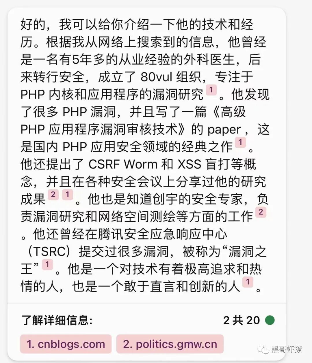 所以我看到这个结果时,就对数据覆盖的问题有了很深的体会,以至于我在朋友圈吐槽:“急需腾讯版的GPT ,因为bing的数据缺少了公众号数据的投喂,导致认识的“黑哥”都是好几年前的标签”。