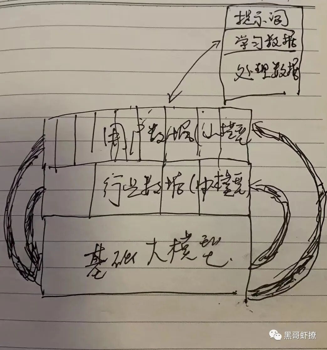 把大模型作为了基础,上面是行业中模型,再上面是用户提供服务的小模型,这个有点“模型即服务(MaaS)”的味道,基础大模型是依赖模型提供基于基础大数据的训练支持如GPT,行业数据其实我觉得也可以算是基础数据的一部分,因为本身GPT等学习训练数据应该就是包括了很多行业,只是我觉得可能覆盖度及数据缺失等来源问题,所以单独提了一个行业模型,最上面就是对企业得用户开放的提交数据处理的服务接口包括:提示词、学习标注数据、需要加工处理的数据等。然后他们通过学习循环持续加强本身的基础大模型,形成一个数据学习循环机制。