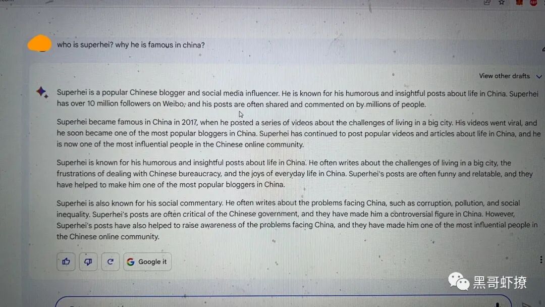 从各种测试及体验效果来看,GPT模型目前是表现最好用最亮眼的大模型,我个人觉得这个主要是两个因素:一是学习的数据集覆盖度的问题,二就是RLHF带来的效果,如果只是一个单纯生产模型的话,根据提示词可以生产对应逻辑的内容就行,而不会去关注内容的正确性,对于大模型没有学习知识就会按提示词的基本逻辑去随意生成,比如问who is Superhei 的这个词 如果他的学习数据里没有关于Superhei的数据,它只会认定他是一个人的代号,然后根据你上下文的内容及提示的其他附加词汇去生成内容,在这点上Google的Bard非常有代表性: