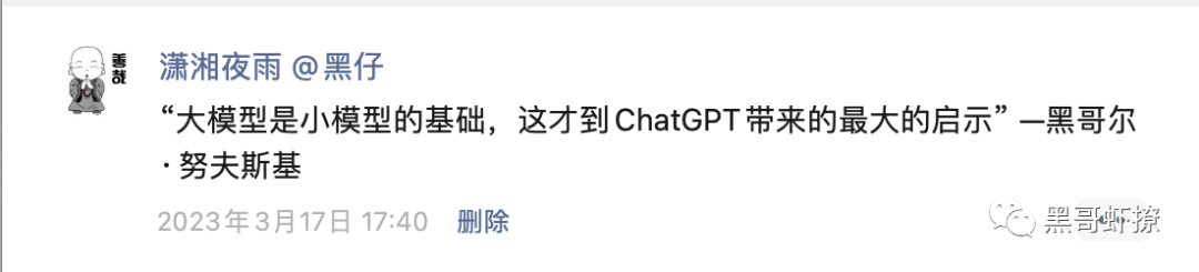 在《ChatGPT展示的是一种能力》文章里其实我聊很多大模型与小模型的观点,主要集中在过度的追求应用场景、成本、意识等问题,导致GPT火之前很少有关注聚焦到大模型上,即使本身像Google的这种大厂也主要聚焦在具体的应用场景上的大模型等问题上,今天主要是进一步聊一下他们大模型与小模型的关系,前面我在朋友圈发了周末一句话:「“大模型是小模型的基础,这才到ChatGPT带来的最大的启示” —黑哥尔·努夫斯基」