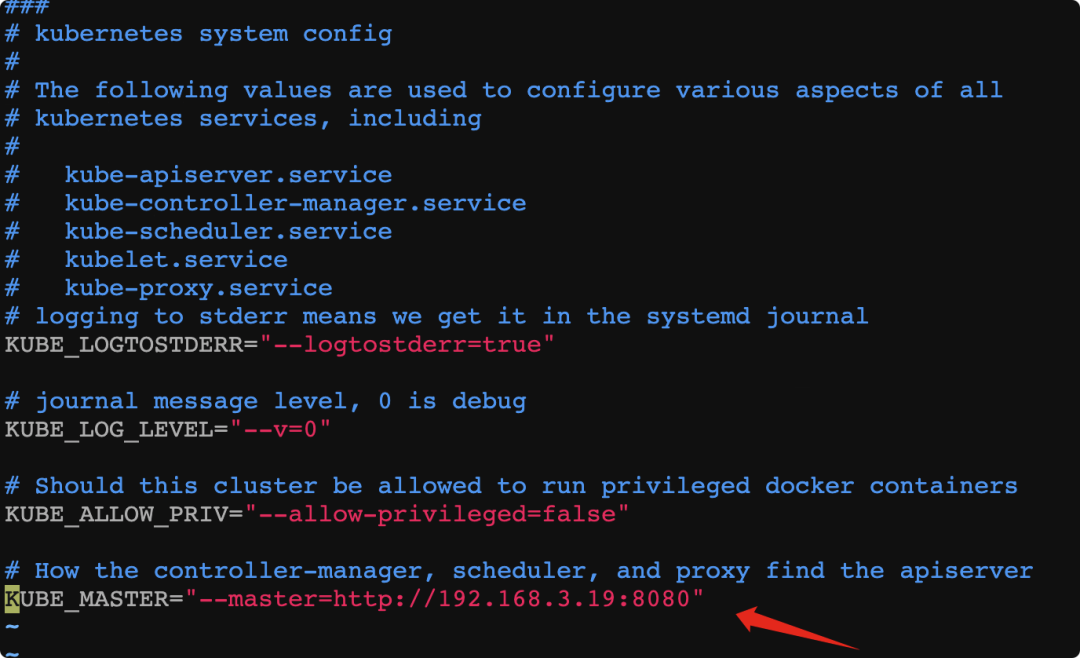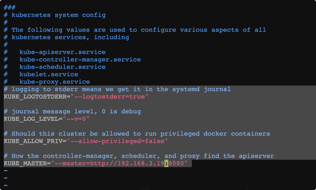 #### kubernetes system config## The following values are used to configure various aspects of all# kubernetes services, including## kube-apiserver.service# kube-controller-manager.service# kube-scheduler.service# kubelet.service# kube-proxy.service# logging to stderr means we get it in the systemd journalKUBE_LOGTOSTDERR="--logtostderr=true"# journal message level, 0 is debugKUBE_LOG_LEVEL="--v=0"# Should this cluster be allowed to run privileged docker containersKUBE_ALLOW_PRIV="--allow-privileged=false"# How the controller-manager, scheduler, and proxy find the apiserverKUBE_MASTER="--master=http://192.168.3.19:8080
