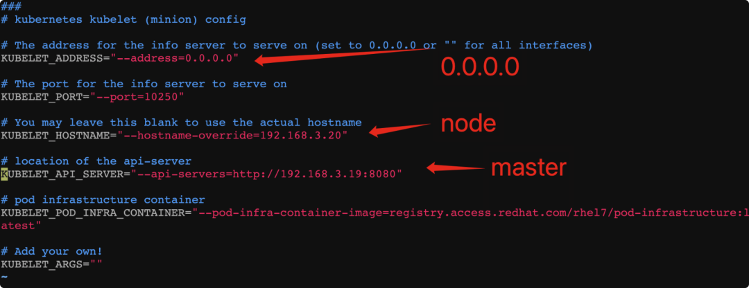 #### kubernetes kubelet (minion) config# The address for the info server to serve on (set to 0.0.0.0 or "" for all interfaces) minion监听的地址KUBELET_ADDRESS="--address=0.0.0.0"# The port for the info server to serve on 监听的端口KUBELET_PORT="--port=10250"# You may leave this blank to use the actual hostnameKUBELET_HOSTNAME="--hostname-override=192.168.3.20"# location of the api-server apiserverKUBELET_API_SERVER="--api-servers=http://192.168.3.19:8080"# pod infrastructure containerKUBELET_POD_INFRA_CONTAINER="--pod-infra-container-image=registry.access.redhat.com/rhel7/pod-infrastructure:latest"# Add your own!KUBELET_ARGS=""