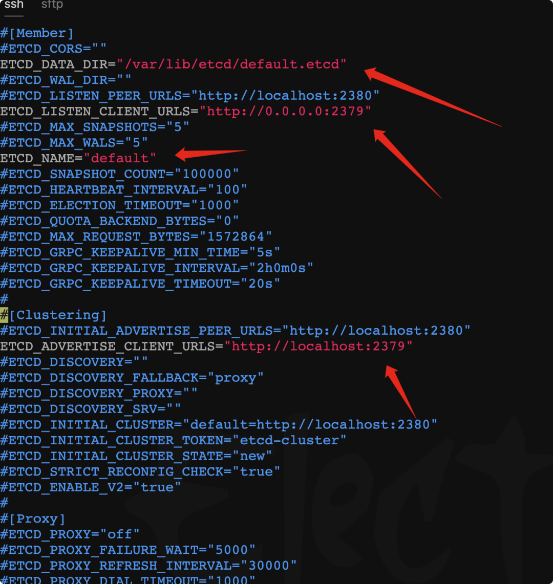 # [Member]# ETCD_CORS=""# etcd数据存储位置ETCD_DATA_DIR="/var/lib/etcd/default.etcd"# ETCD_WAL_DIR=""# ETCD_LISTEN_PEER_URLS="http://localhost:2380" 监听的端口ETCD_LISTEN_CLIENT_URLS="http://0.0.0.0:2379"# ETCD_MAX_SNAPSHOTS="5"# ETCD_MAX_WALS="5"# etcd名称ETCD_NAME="default"# ETCD_SNAPSHOT_COUNT="100000"# ETCD_HEARTBEAT_INTERVAL="100"# ETCD_ELECTION_TIMEOUT="1000"# ETCD_QUOTA_BACKEND_BYTES="0"# ETCD_MAX_REQUEST_BYTES="1572864"# ETCD_GRPC_KEEPALIVE_MIN_TIME="5s"# ETCD_GRPC_KEEPALIVE_INTERVAL="2h0m0s"# ETCD_GRPC_KEEPALIVE_TIMEOUT="20s"## [Clustering]# ETCD_INITIAL_ADVERTISE_PEER_URLS="http://localhost:2380" 集群监听的端口ETCD_ADVERTISE_CLIENT_URLS="http://localhost:2379"