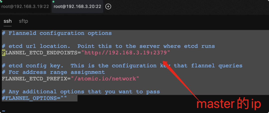 # Flanneld configuration options# etcd url location. Point this to the server where etcd runs etcd的地址和端口FLANNEL_ETCD_ENDPOINTS="http://192.168.3.19:2379"# etcd config key. This is the configuration key that flannel queries# For address range assignment 服务范围FLANNEL_ETCD_PREFIX="/atomic.io/network"# Any additional options that you want to pass 其他# FLANNEL_OPTIONS="