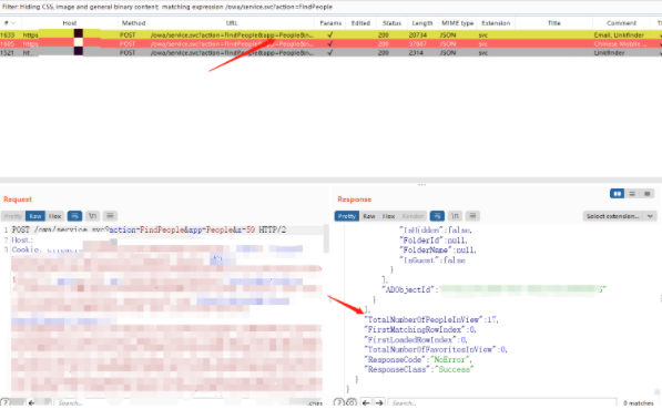 /owa/service.svc?action=FindPeople&app=People3、我们可以发现,筛选出来还是有很多条,我们要选中正确的那条(返回包里面有TotalNumberOfPeopleInView字段)