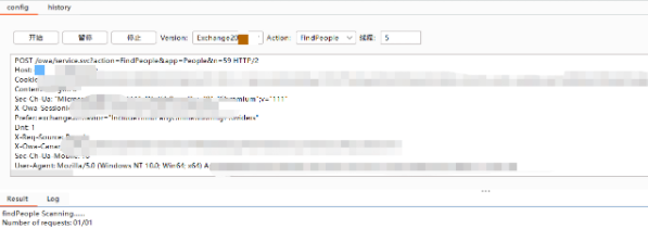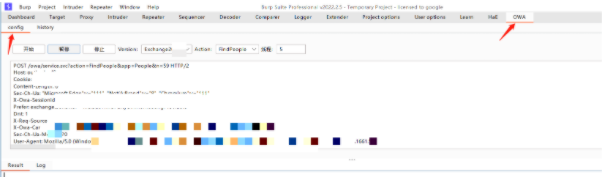 5、进入到我们的插件OWA -> config 面板,这里面配置我们的exchange服务器版本,因为不同版本的请求包会有细微的差别,我们可以通过version调整我们的版本,然后action选中FindPeople