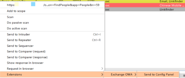 4、选中该请求,右键菜单 Extensions -> Exchange OWA -> Send to Config Panel