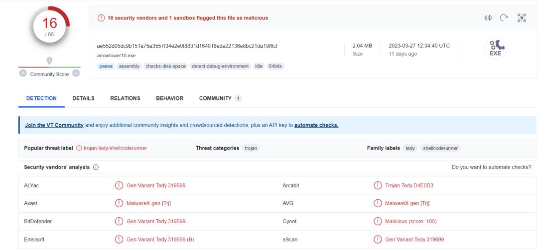 过了11天,再次进行查看时发现变成16个了,但是不重要,随便改一下特征码重写打包即可,我们仅需关注刚上传时的查杀: