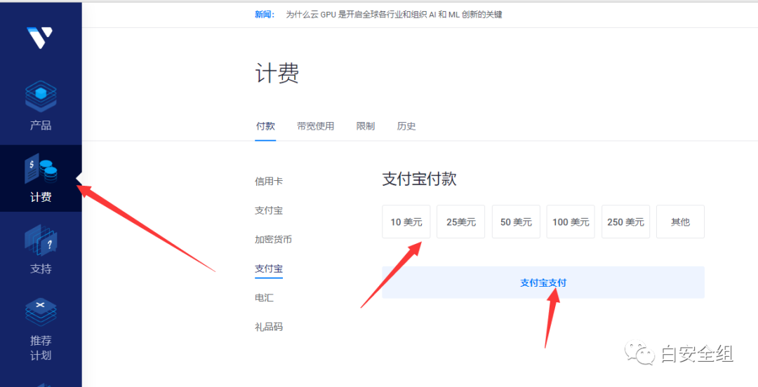 这里使用vultr可能需要一个小小的梯子,反正我没有梯子是上不去得,大家这里看自己,注册好账号我们需要重置,这里我们可以选择支付宝进行充值。