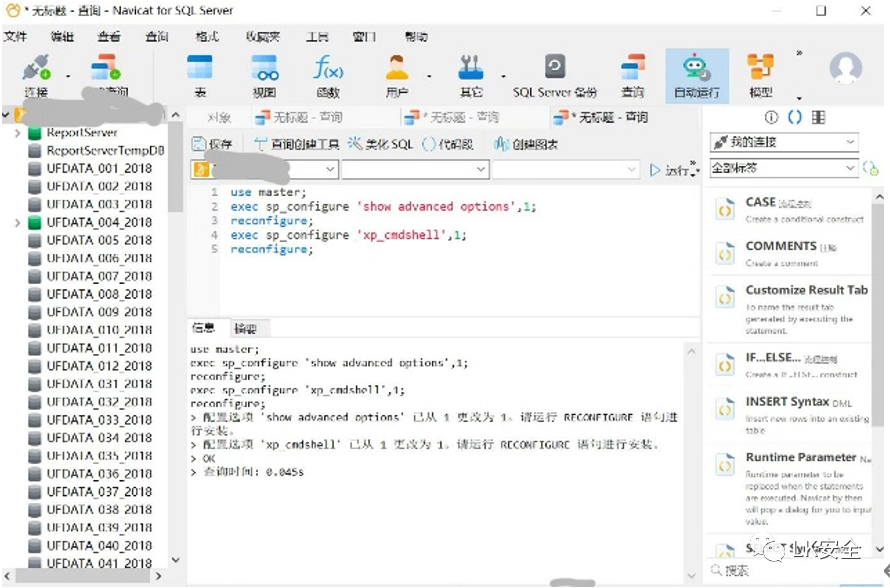 这个想法也是得到了大佬的验证,那接下来就是复现了。掏出fscan对着1433口爆破,fscan是大佬推荐的打内网神器,也是成功拿到了账号密码sa/sa,利用navicat-sql server进行连接,也是成功连上。