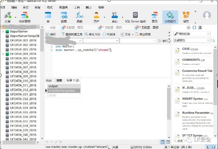exec master..xp_cmdshell "whoami";接下来会发生什么,嘿嘿嘿就不用我多说了吧。