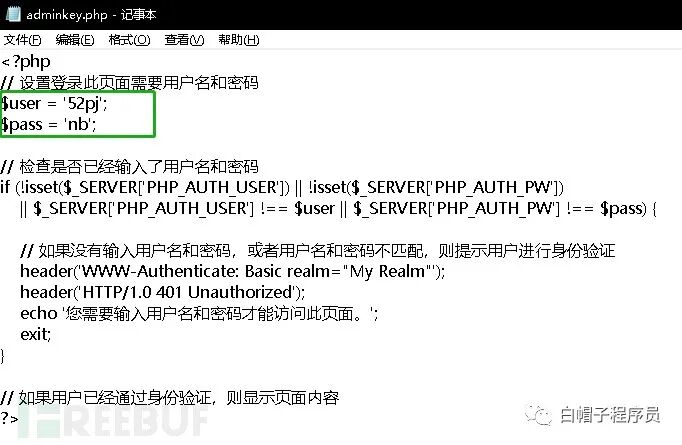 打开adminkey.php文件,可以看到进行后台操作,需要通过Authenticate标头的形式进行后台用户登录验证的,同时源代码中还写了后台的登录用户名和密码。