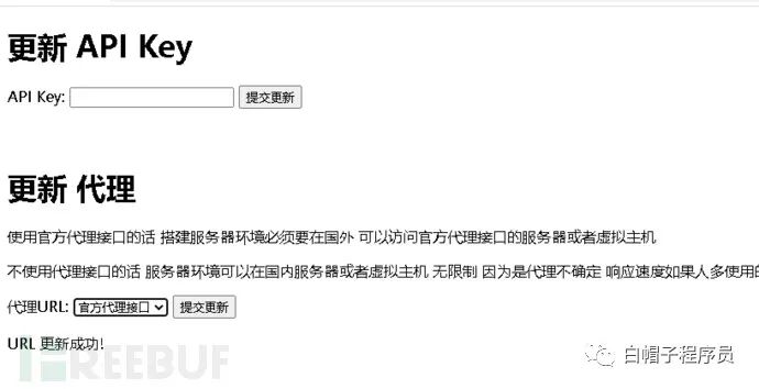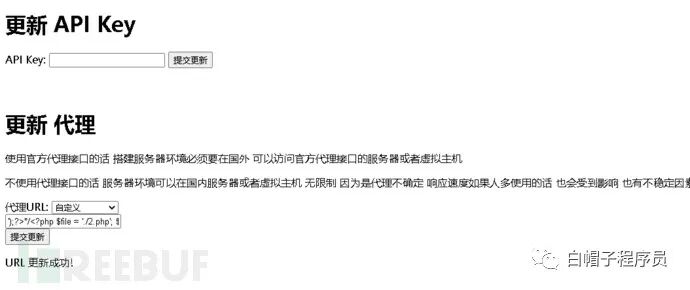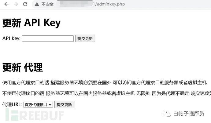 访问http://xx.xx.xx.xx/adminkey.php ,并且登录成功,只有更新API Key和更新代理两个功能。但是不论是该源码的原始版本还是这个二开版本,都是不需要数据库就可以直接运行的,所以它既然能更新Key不排除是写入到了本地文件中再进行调用的。
