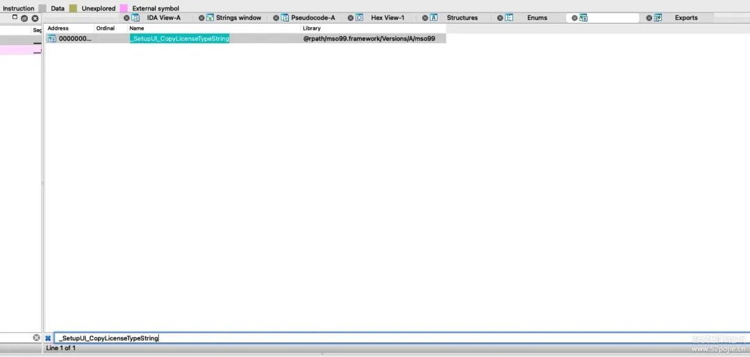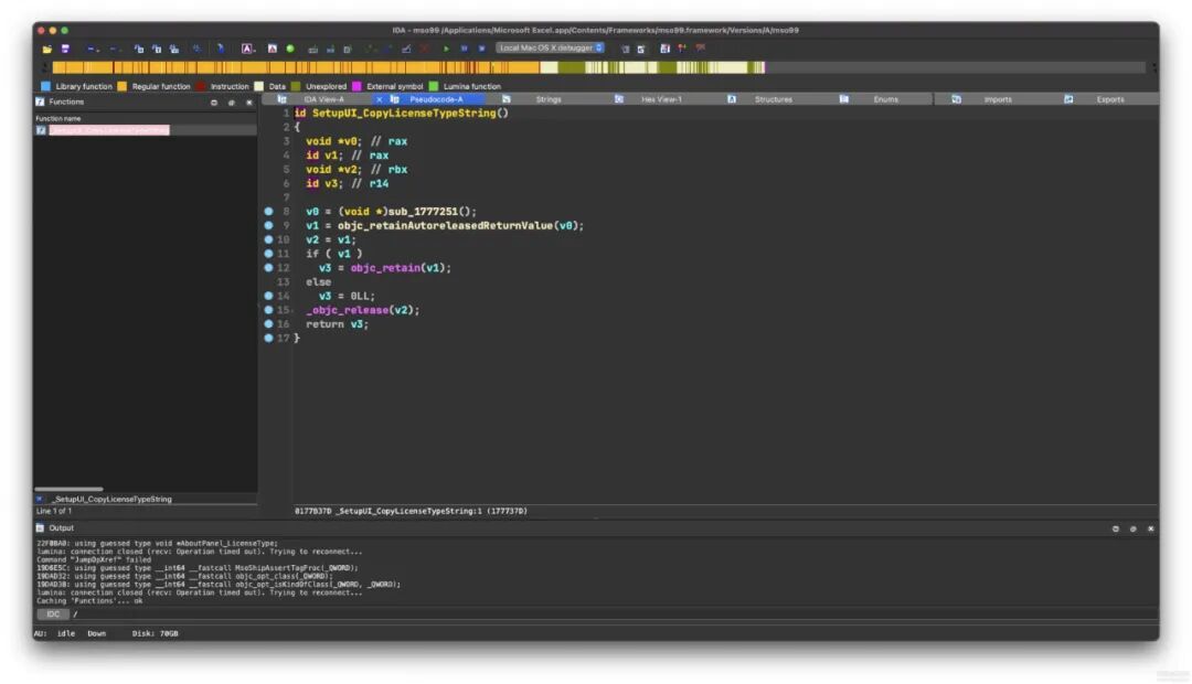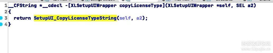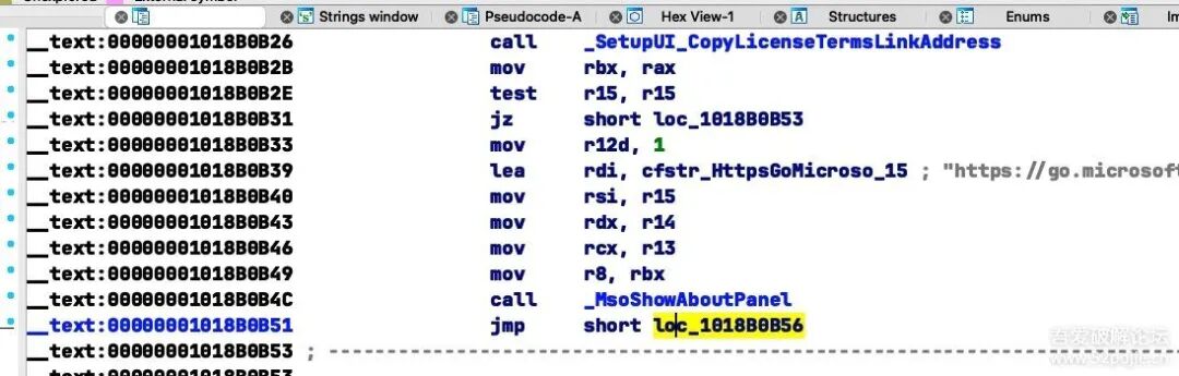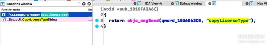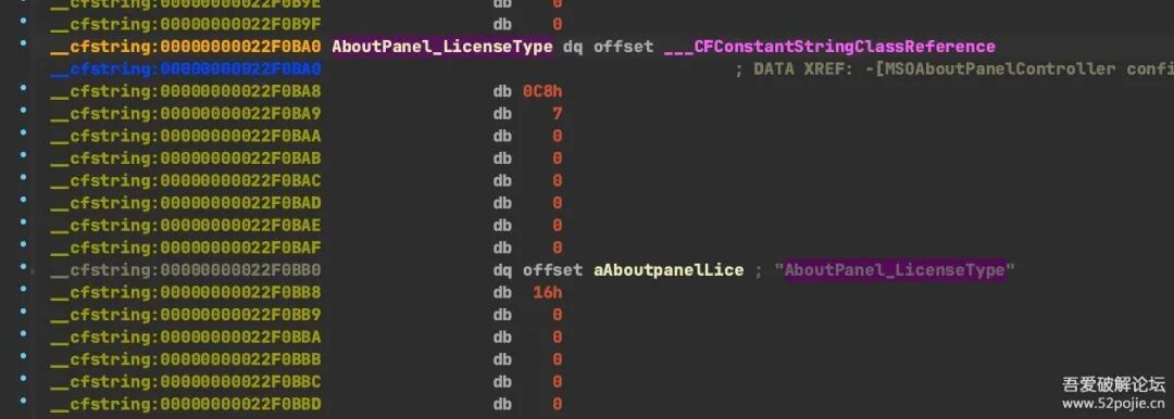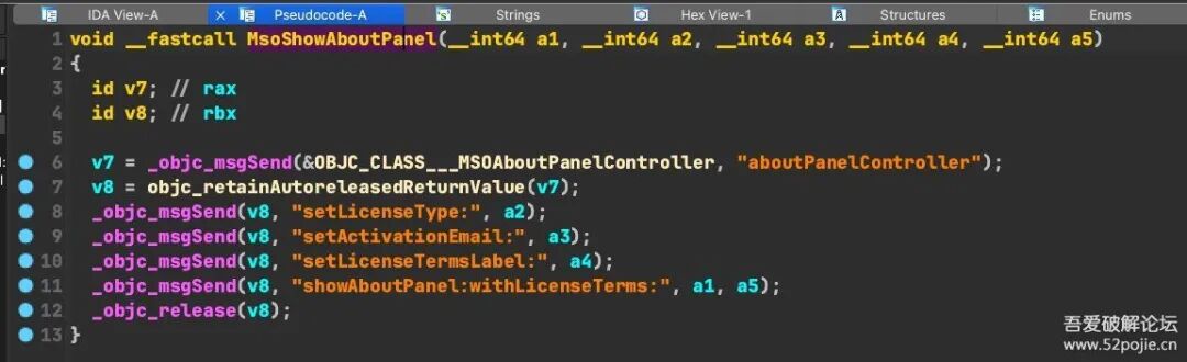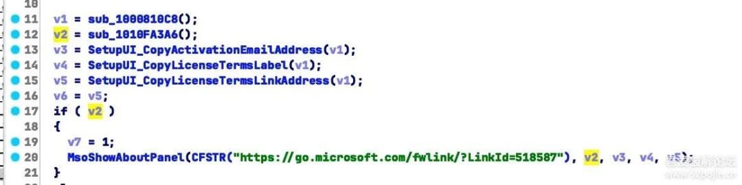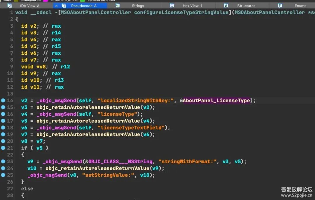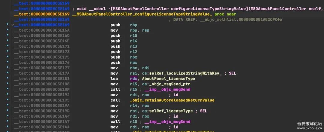 _objc_msgSend(v8, "setLicenseType:", a2);显然就是设置授权类型了,那么我们再往上找到a2传入参数的地方:复制代码 隐藏代码 frame #10: 0x00000001018b0b51 Microsoft Excel`___lldb_unnamed_symbol123578 + 89