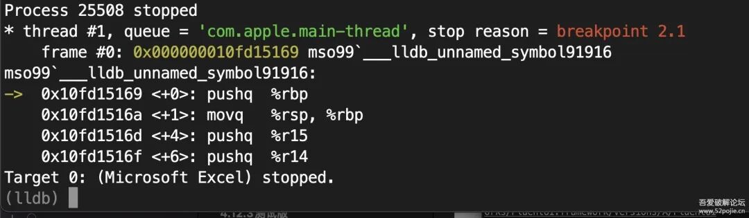 Breakpoint 4: where = mso99`SetupUI_CreateLocalizedRFMMessageBarStrings + 830, address = 0x000000010f2e2958