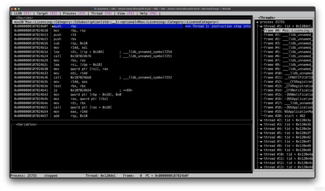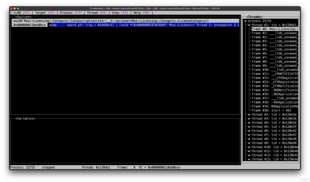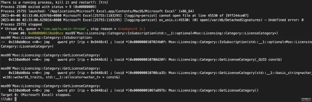 Breakpoint 3: where = mso99`symbol stub for: Mso::Licensing::Category::IsSubscription(std::__1::optional<Mso::Licensing::Category::LicenseCategory>), address = 0x0000000110ab0bce
