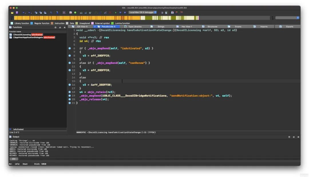 0000000001A3AD3F aDocsuibridgesu db 'DocsUIBridgeSubscriptionActivatedNotification',0复制代码 隐藏代码 char __cdecl -[DocsUILicensing isActivated](DocsUILicensing *self, SEL a2)