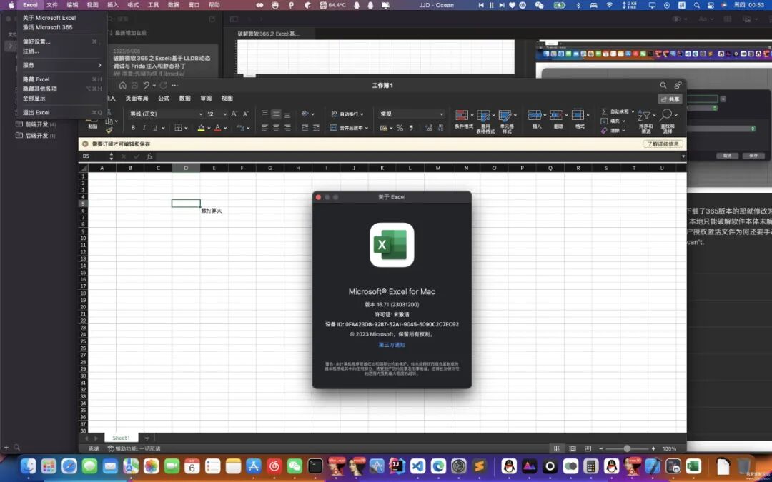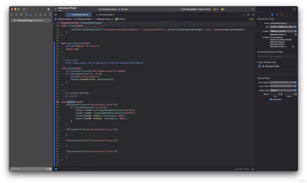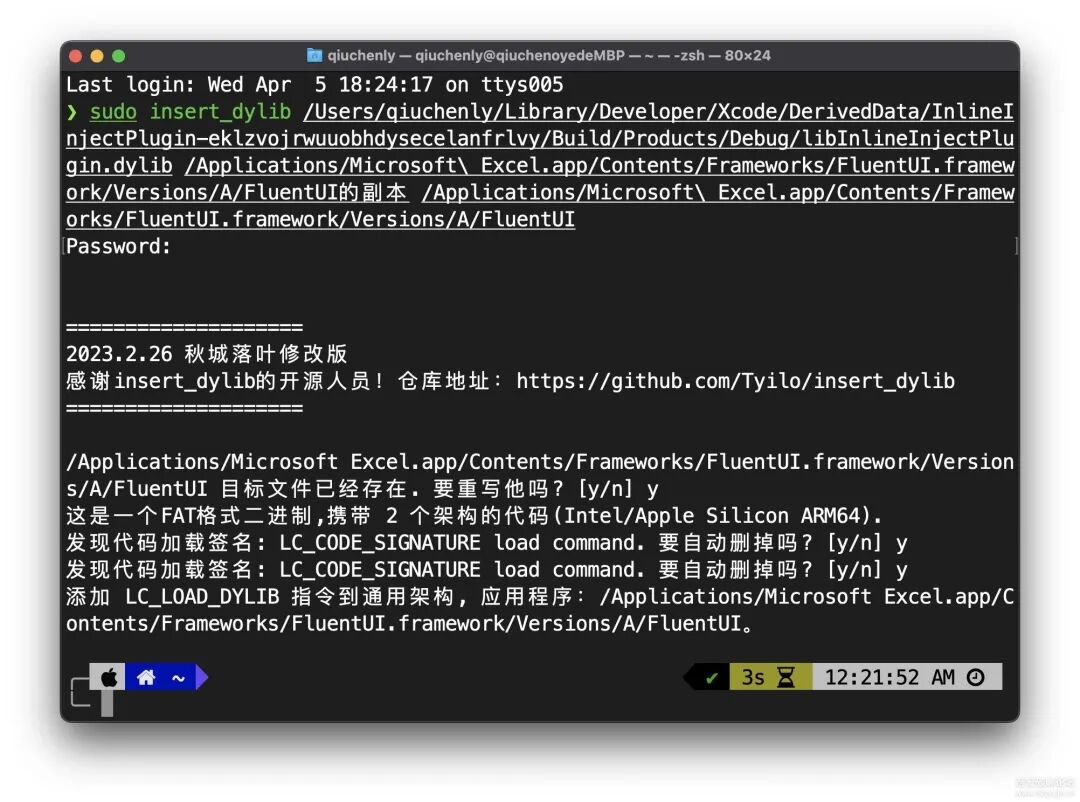 复制代码 隐藏代码 sudo insert_dylib /Users/qiuchenly/libInlineInjectPlugin.dylib /Applications/Microsoft\ Excel.app/Contents/Frameworks/FluentUI.framework/Versions/A/FluentUI的副本 /Applications/Microsoft\ Excel.app/Contents/Frameworks/FluentUI.framework/Versions/A/FluentUI