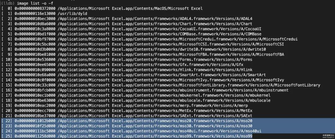 复制代码 隐藏代码 [ 22] /Applications/Microsoft Excel.app/Contents/Frameworks/mso20.framework/Versions/A/mso20 0x0000000107e71000