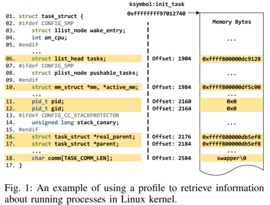 配置文件包含内核符号的地址和内核结构总体布局,它们指导内存取证工具找到感兴趣的内核对象并从所需字段中检索值。图 1 展示了使用配置文件从 task_struct 检索流程信息的示例。首先,内存取证工具从 init_task 符号中获取第一个进程的虚拟地址。然后将其翻译成对应的物理地址,并在内存转储中定位 task_struct 对象。接下来,从配置文件中获取 task_struct 中所需字段的偏移量(在图 1 中突出显示)。如图 1 所示,最大的挑战是 Linux 内核配置文件是特定于配置和版本的:Linux 项目经常升级并包含各种编译配置,为特定版本和配置生成的配置文件不太可能被另一个内核重用。现有方法从用于构建此内核的内核头文件和配置构建配置文件。但是,它需要访问实时系统并安装内核头文件和编译器工具链,这对于犯罪现场调查、云服务和生产环境等纯二进制取证是不可能的。其他方法提出了仅二进制方法来解决这个问题,但根据他们的论文,未能实现高精度和召回率。在本文中,我们提出了一种具有高通用性和准确性且效率合理的逻辑推理方法。