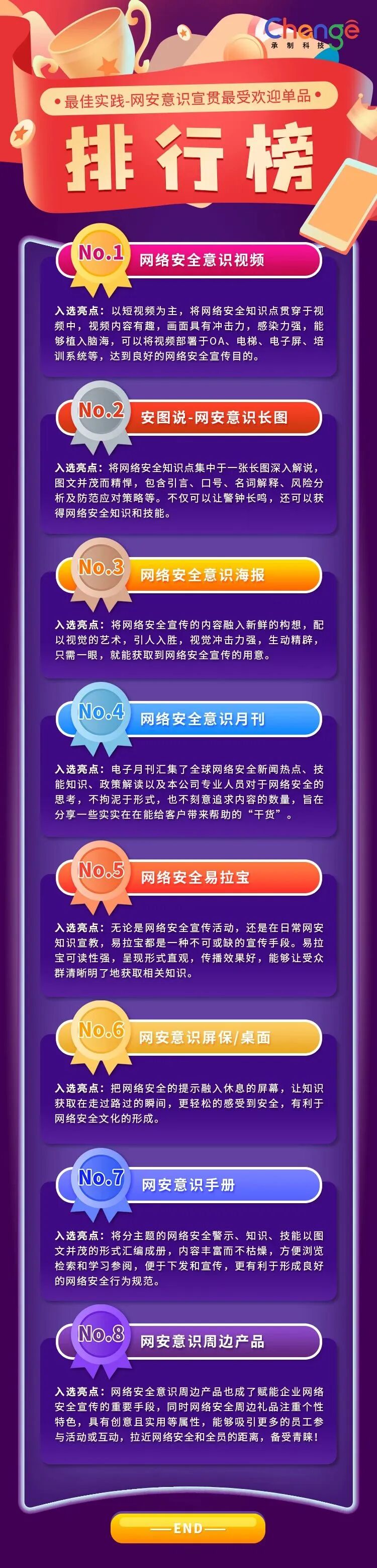 作为拥有国际视野且国内一流的网络安全意识宣贯服务商,承制科技从理念到行动、从抽象到具体,深度参与了众多企业的网络安全文化建设支撑工作,协助培养员工良好的思维习惯和行为模式。在众多项目的实践中,承制总结出八种受欢迎的网络安全意识宣贯单品并根据实践经验进行了大体排名。