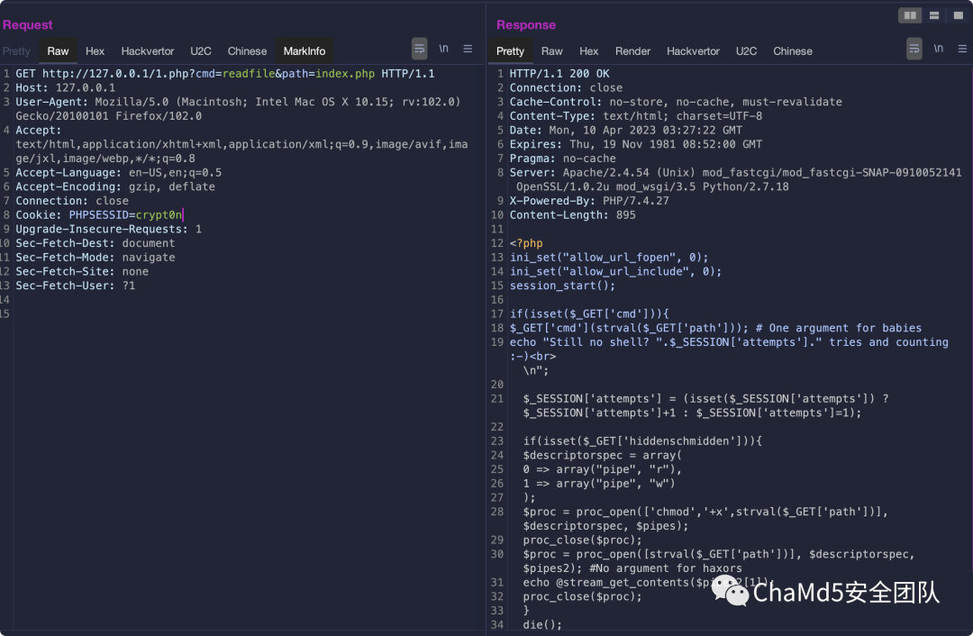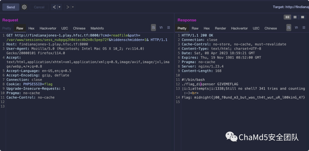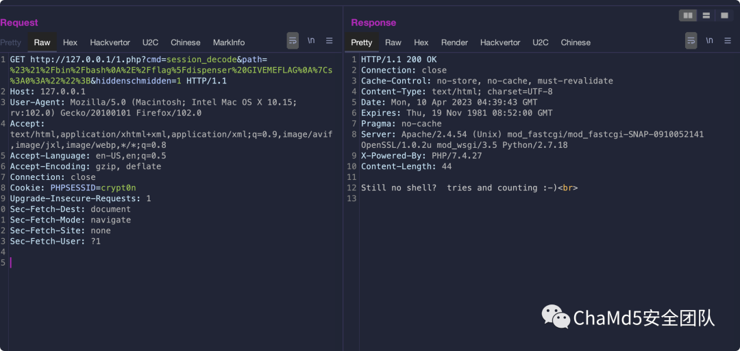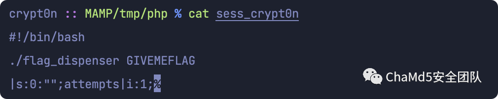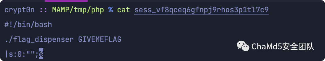 发现当传入hiddenschmidden是,path会被拿去给proc_open执行,执行ls命令后发现目录下面存在flag_dispenser文件,但需要传入GIVEMEFLAG参数。执行phpinfo()后发现session文件存储在/var/www/sessions中,可以在$_GET['cmd'](strval($_GET['path']));利用session_decode函数来污染session文件。payload如下: