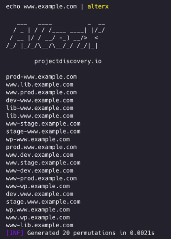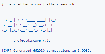 $ chaos -d tesla.com | alterx | dnsx3、-enrich选项可用于填充已知子域作为世界输入以生成目标感知排列。