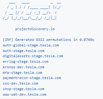 go install github.com/projectdiscovery/alterx/cmd/alterx@latest2、在现有的被动子域列表上运行 alterx 的示例为tesla.com我们提供了10 个使用dnsx解析的额外新的有效子域。