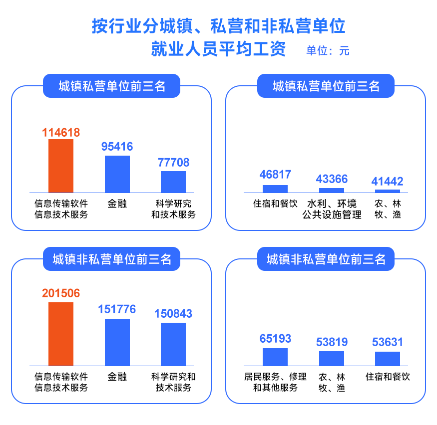 前不久国家统计局发布《中国统计年鉴2022》,在城镇私营和非私营单位就业人员平均工资排行中,信息传输、软件、信息技术服务行业的薪资都稳居榜首!