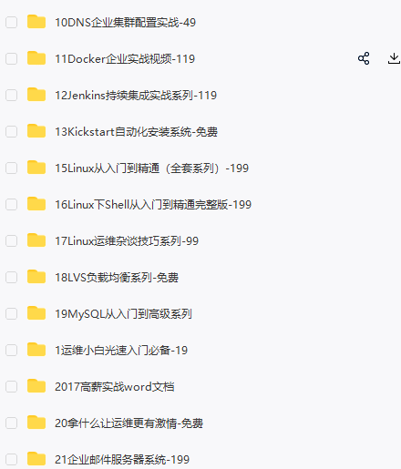 目前总共更新近30套全系列的视频教程,接下来还将公布DevOps容器架构师+Hadoop大数据运维+P8架构思维专题,都将会全部公益开源出来,每个知识点都讲得清清楚楚,0基础小白只要认真学习,也能够学得会,希望能够帮助更多人!整份文档一共有将近 200 页,全部为大家展示出来肯定是不太现实的,为了不影响大家的阅读体验就只展示了部分内容,还望大家海涵,希望能帮助到您面试前的复习且找到一个好的工作,也节省大家在网上搜索资料的时间来学习!需要的小伙伴扫码免费领取: