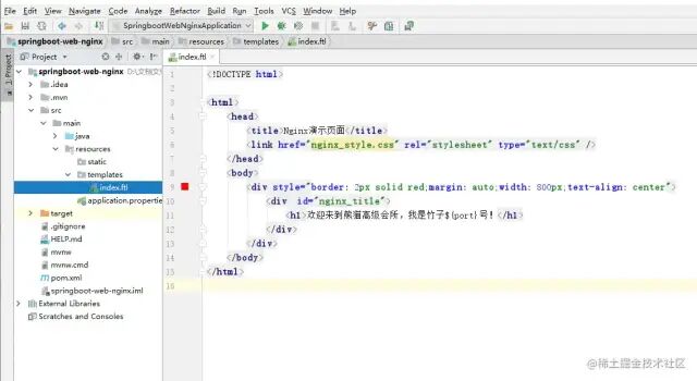 首先通过SpringBoot+Freemarker快速搭建一个WEB项目:springboot-web-nginx,然后在该项目中,创建一个IndexNginxController.java文件,逻辑如下: