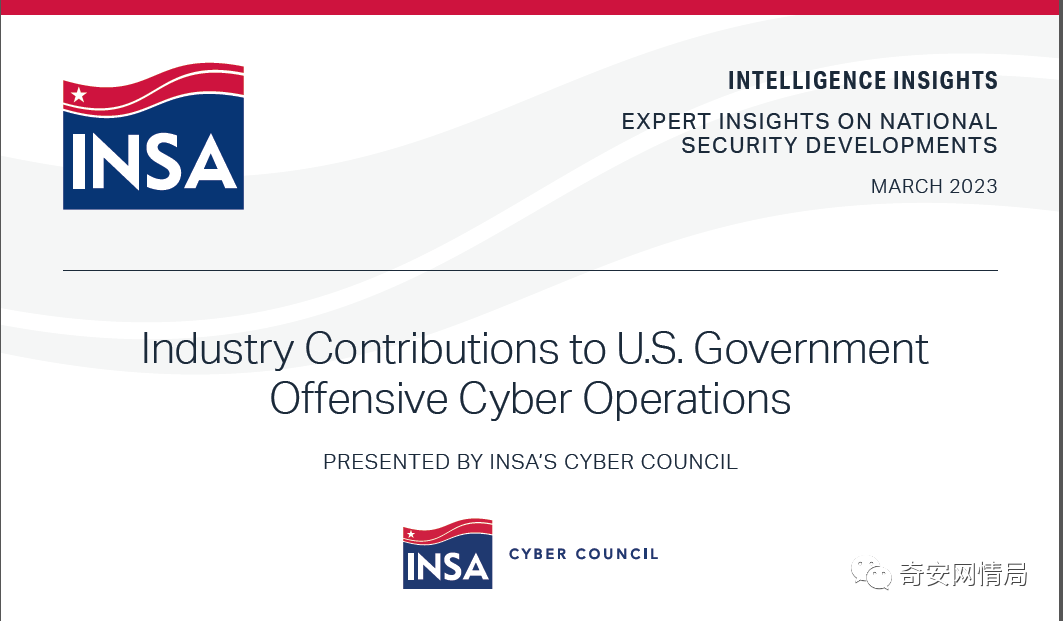美国无党派、非营利性的贸易协会“情报和国家安全联盟”(INSA)3月28日发布题为《行业对美国政府进攻性网络行动的贡献》的报告。