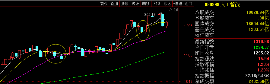 早盘人工智能指数跳水,仅仅跌-0.5%就迫不及待反弹,我对他的设想是,哪怕跌-1%,我就积极干了。