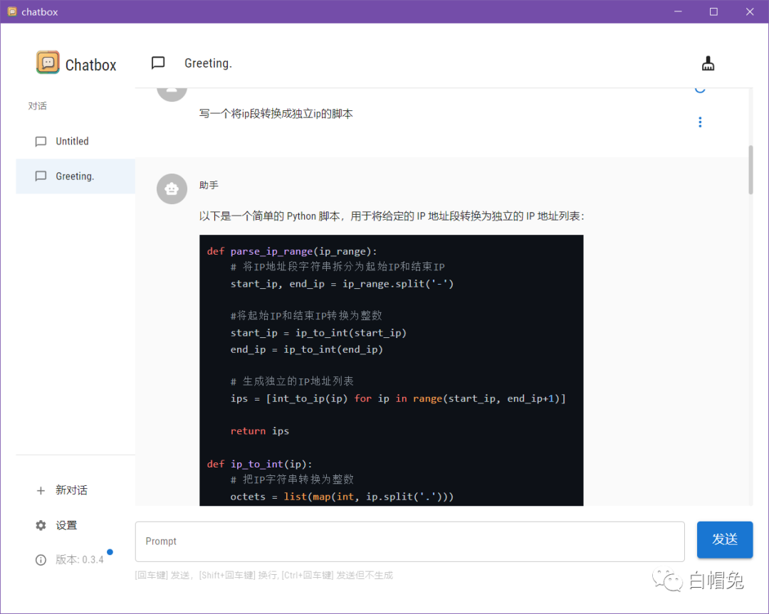 def parse_ip_range(ip_range):# 将IP地址段字符串拆分为起始IP和结束IPstart_ip, end_ip = ip_range.split('-')#将起始IP和结束IP转换为整数start_ip = ip_to_int(start_ip)end_ip = ip_to_int(end_ip)# 生成独立的IP地址列表ips = [int_to_ip(ip) for ip in range(start_ip, end_ip+1)]return ipsdef ip_to_int(ip):# 把IP字符串转换为整数octets = list(map(int, ip.split('.')))return (octets[0] << 24) + (octets[1] << 16) + (octets[2] << 8) + octets[3]def int_to_ip(ip_int):# 把整数转换为IP字符串return ".".join(map(str, [(ip_int >> 24) & 0xff, (ip_int >> 16) & 0xff, (ip_int >> 8) & 0xff, ip_int & 0xff]))# 示例用法ip_range = '192.168.0.1-192.168.0.10'ips = parse_ip_range(ip_range)for ip in ips:print(ip)