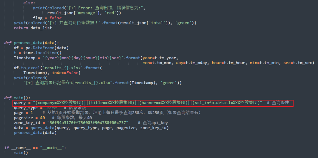 # 查询条件query = "(company=xxx有限公司)||(title==xxx有限公司)||(banner==xxx有限公司)||(ssl_info.detail=xxx有限公司)"