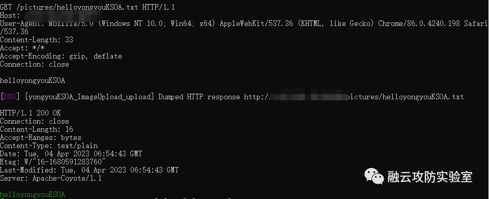 1.使用POC上传helloyongyouKSOA.txt文件,并访问/pictures/helloyongyouKSOA.txt,得到回显