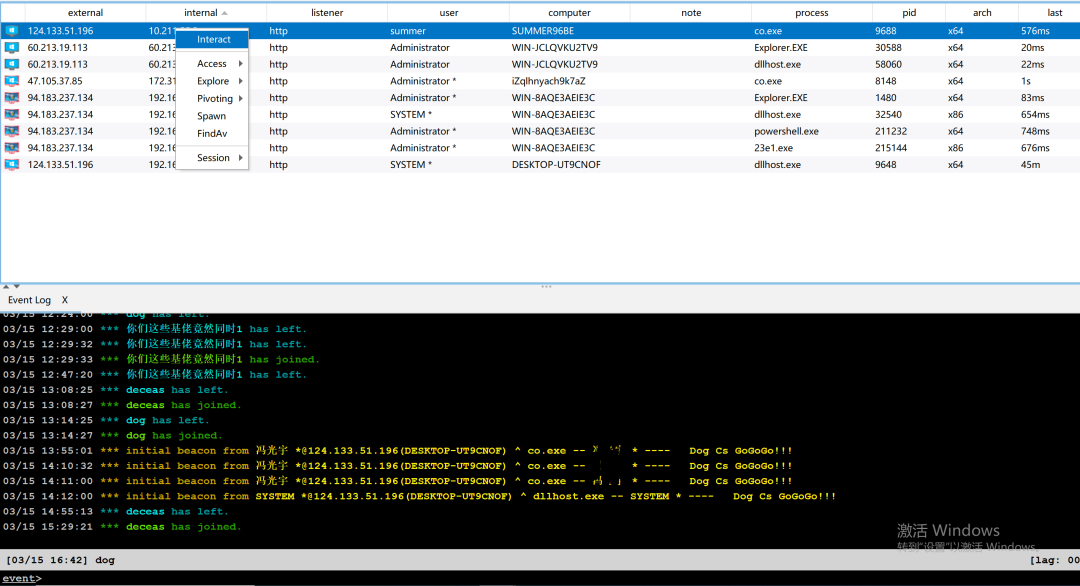 在被获取权限PC处,右键选择Interact,可进入命令执行