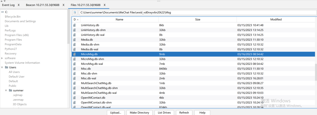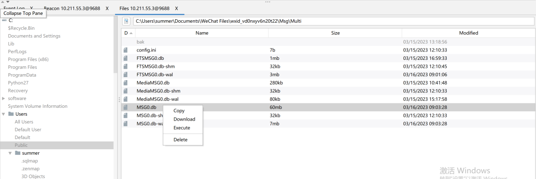 连接被获取权限PC的文件夹,找到目录C:\Users\summer\Documents\WeChat Files\wxid_vd0nxyv6n20t22\Msg\Multi,下载文件MSG0.db并存放到自定义目录即可