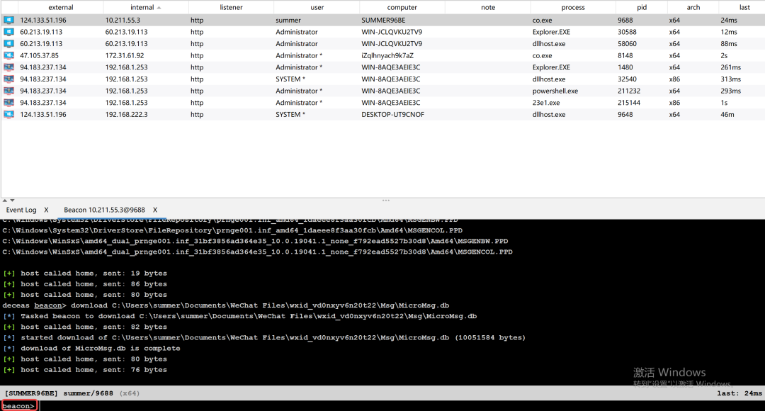 1、获取微信数据库密钥,执行命令execute-assembly C:\Users\summer\Desktop\test\dumpkey.exe