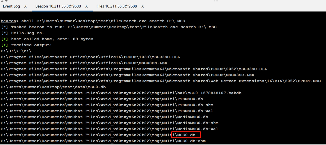 执行命令shell C:\Users\summer\Desktop\test\FileSearch.exe search C:\ MSG,可找到文件MSG0.