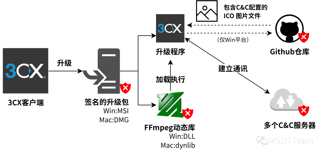 近期知名企业网络电话系统提供商3CX遭受了一起供应链攻击事件,Win/Mac平台的多个版本的安装包被植入恶意代码,使全球约60万家企业用户受到潜在威胁。