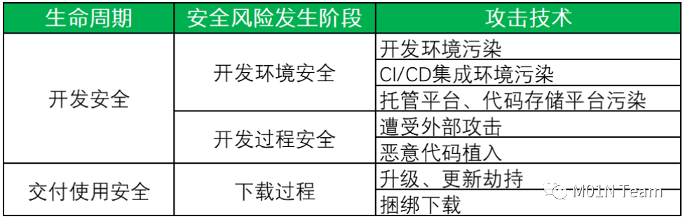 绿盟科技在2022年发布了《软件供应链安全技术白皮书》,靶向聚焦、着力剖析供应链风险产生的内部动因和运行机理。与白皮书一起发布的《软件供应链安全风险表》对供应链产品在开发与交付生命周期全过程的风险控制进建立了模型。此处使用该模型对3CX供应链攻击事件所涉及的生命周期安全风险与攻击技术进行了评估。